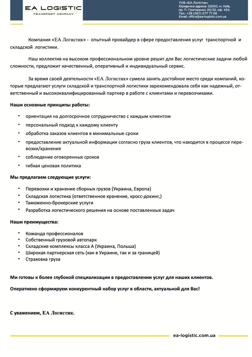 У EA Logistic ми прагнемо надавати клієнтам найкращий сервіс. Зв’яжіться з нами сьогодні і дізнайтеся, як ми можемо допомогти бізнесу досягти успіху.